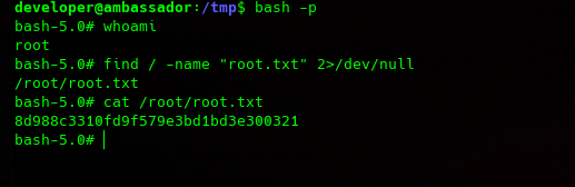 vemos que ya tenemos permisos SUID a la bash, solo ejecutamos bas -p (-p de privilege) y estamos ya como el usuario root y otra máquina mas hecha y apuntada