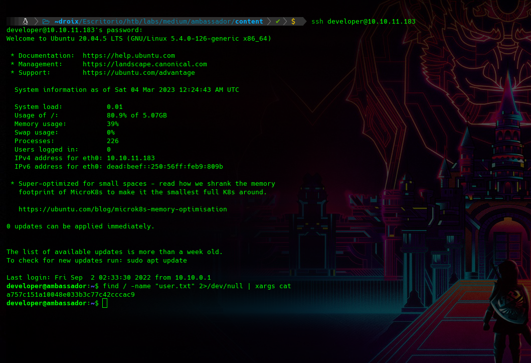y estamos dentro de ssh la primera flag completada vamos a escalar nuestro privilegio:))