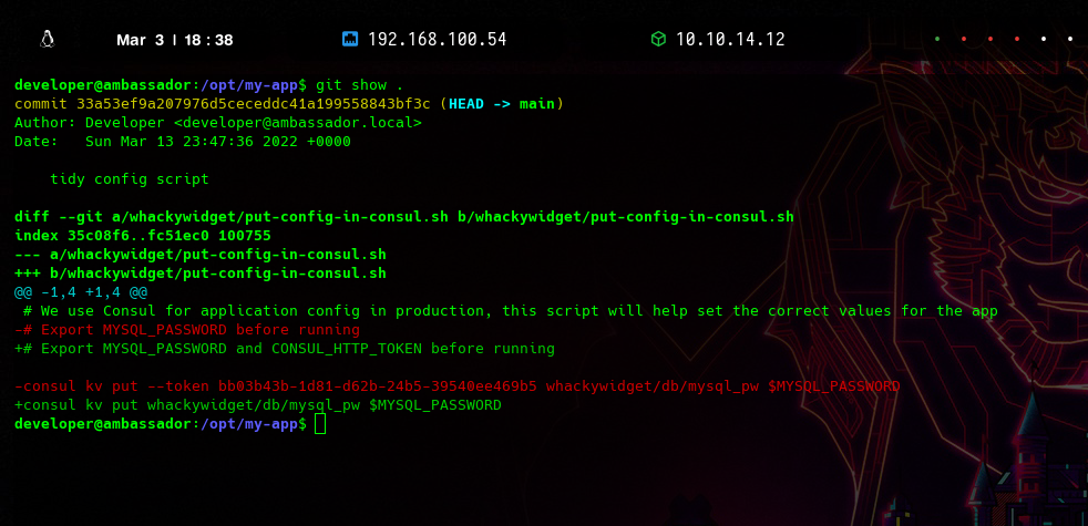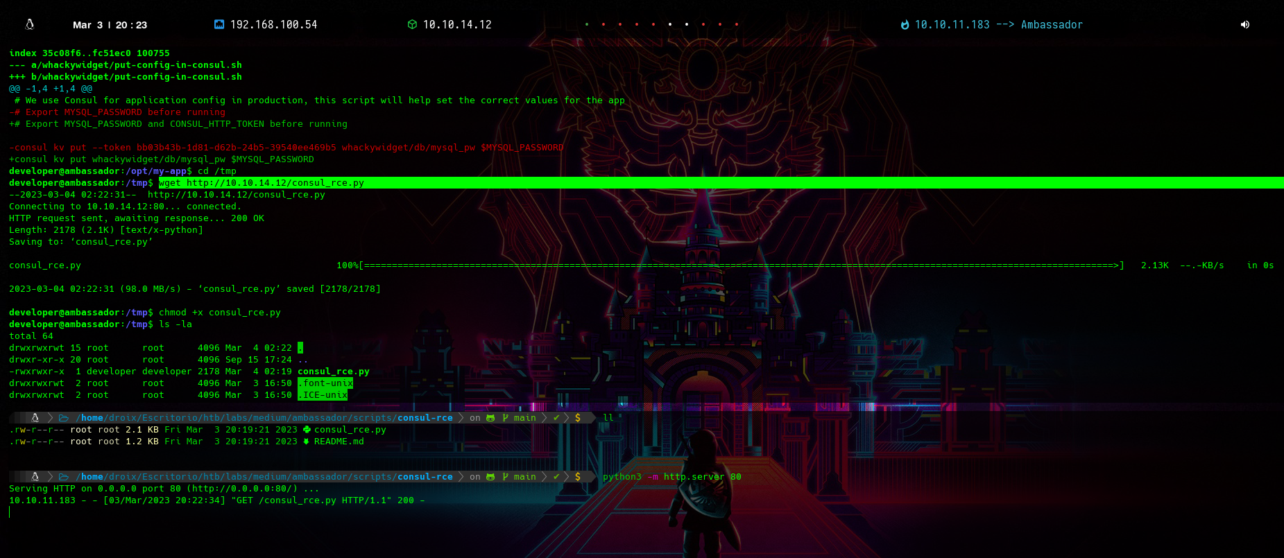vemos un token que se quitó en el ultimo commit todo esto haciendose con consul “Consul es una herramienta Open Source para la detección y configuración de servicios en la infraestructura de aplicaciones de centros de datos distribuidos y de alta disponibilidad.” buscando un exploit asociado vemos uno de Hashicorp-Consul “explota una vulnerabilidad de inyección de comandos en Consul Api Services. La vulnerabilidad existe en el ServiceIDparámetro de la PUT /v1/agent/service/registerPunto final de la API. El ServiceIDEl parámetro se utiliza para registrar un servicio con el agente Consul. El ServiceIDEl parámetro no se desinfecta y permite la inyección de comandos. Esta vulnerabilidad se puede utilizar para ejecutar comandos arbitrarios en el host que ejecuta el agente Consul.” como dicha vulnerabilidad se da en el host de la máquina victima en local me transferiré el script en python compartiendome un servidor con python3