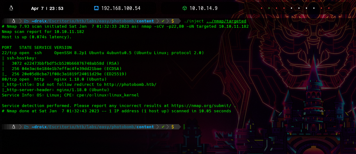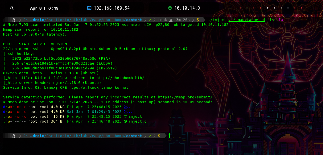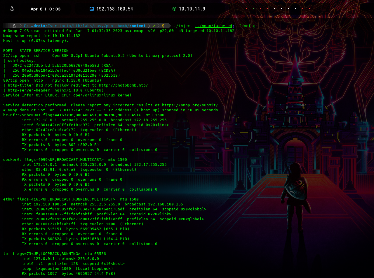 La salida mostrará el contenido del archivo llamado targeted (de nuestro escaneo con nmap), pero seguirá interpretando el resto del parámetro de entrada. El ; se utiliza como separador de comandos y el texto que sigue se evalúa como un nuevo comando. En este caso, se ejecutará el comando ifconfig y el programa imprimirá al último mis interfaces de red como le indiqué