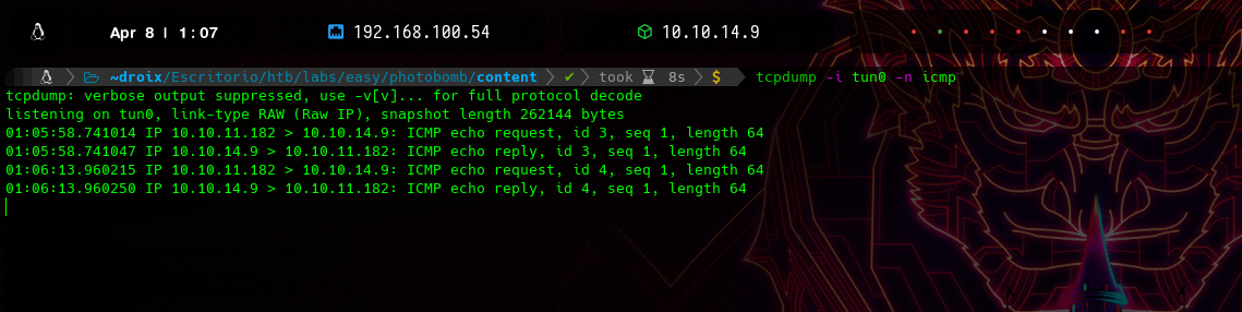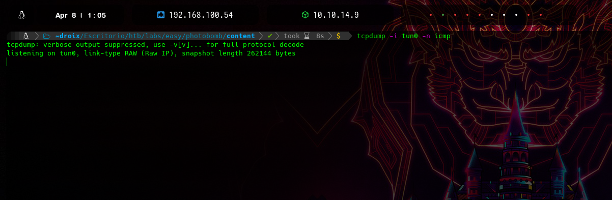 me pondré en escucha por la interfaz tun0 a escucha de trazas icmp