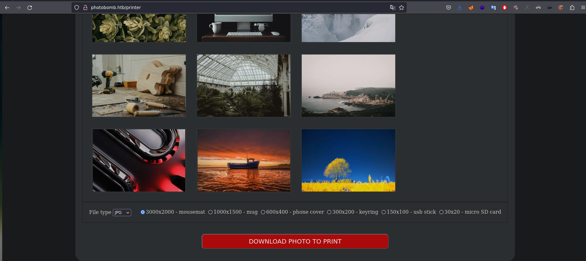 Para este otro ejemplo agarré una máquina de HackTheBox que tiene esta vulnerabilidad expuesta, una vez enumerando y recopilando información sobre nuestro activo. vemos un sitio web que nos permite elegir imagenes en diferentes formatos