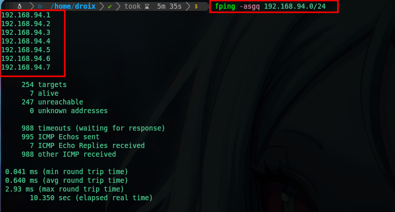 con fping podemos hacer un barrido por todo el segmento de igual forma a para mostrar los objetivos que están activos, s para imprimir detalles, g para generar una lista de objetivos de la red indicando el CIDR, y q para no mostrar los resultados por host.