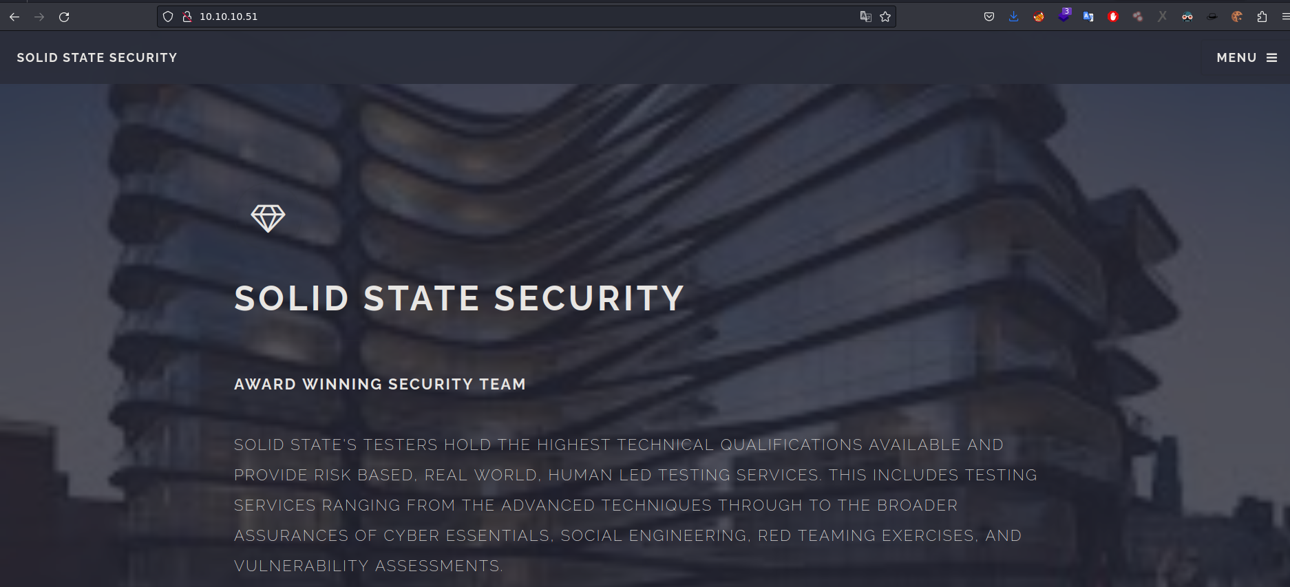 http://10.10.10.51 [200 OK] Apache[2.4.25], Country[RESERVED][ZZ], Email[webadmin@solid-state-security.com], HTML5, HTTPServer[Debian Linux][Apache/2.4.25 (Debian)], IP[10.10.10.51], JQuery, Script, Title[Home - Solid State Security]