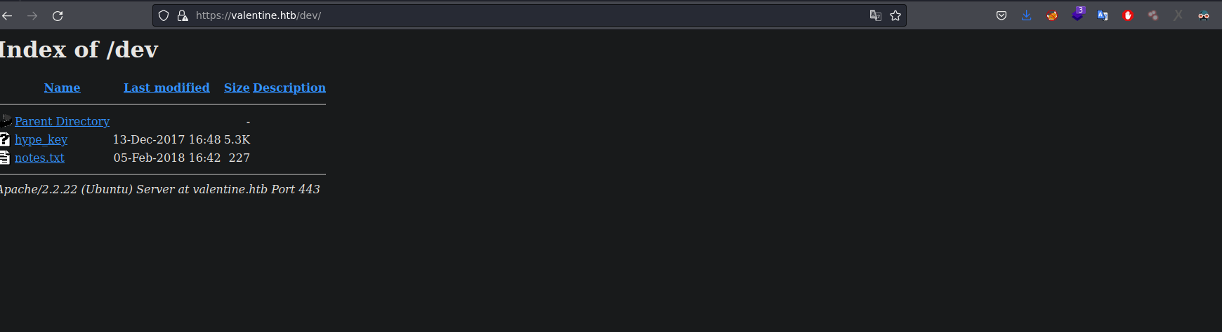 /dev (Status: 301) [Size: 312] [--> http://valentine.htb/dev/]